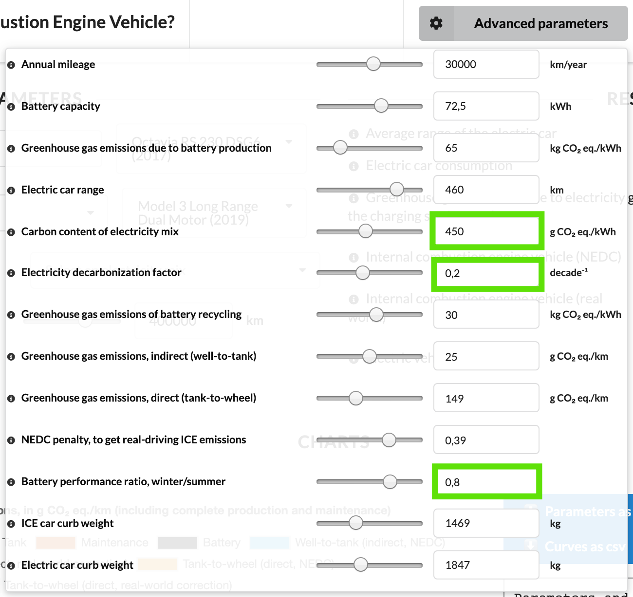19:56 Přehled použitých parametrů pro model (450g CO2 z výroby 1 kWh elektřiny a 20% snížení během této dekády)